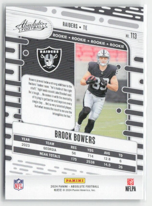You are purchasing a 2024 Panini Absolute Brock Bowers #113 Retail RC. You will receive the exact item in the photographs. Thank you for looking.