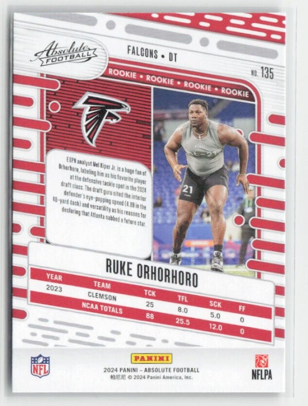 You are purchasing a 2024 Panini Absolute Ruke Orhorhoro #135 Retail RC. You will receive the exact item in the photographs. Thank you for looking.