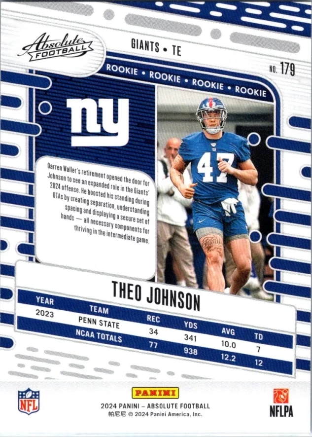 This is a nice example of a 2024 Panini Absolute #179 Theo Johnson Retail