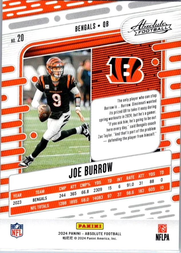 This is a nice example of a 2024 Panini Absolute #20 Joe Burrow Retail