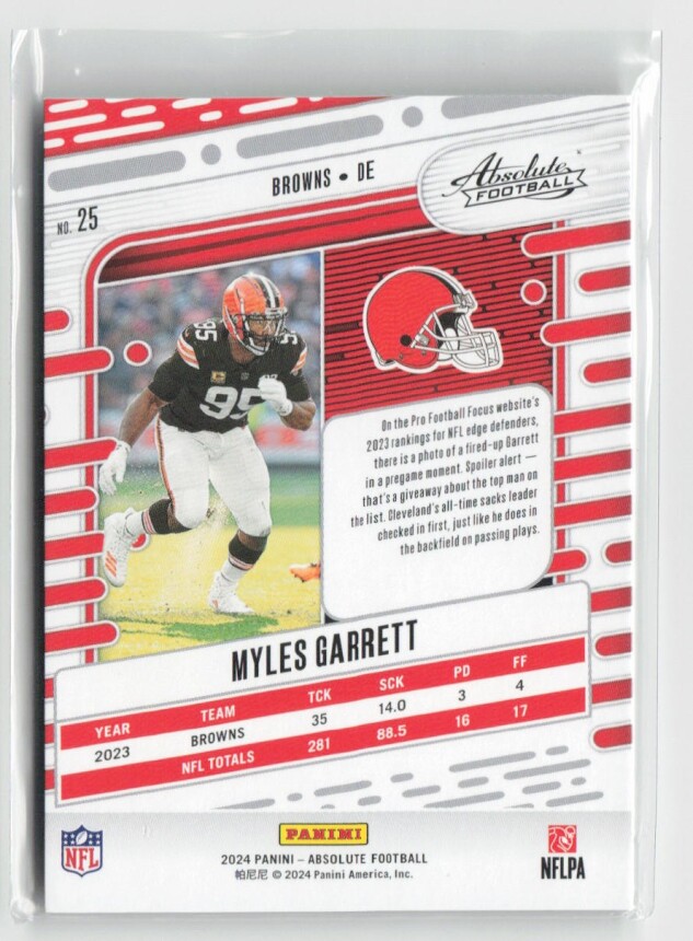 You are purchasing a 2024 Panini Absolute Myles Garrett #25 Spectrum. You will receive the exact item in the photographs. Thank you for looking.