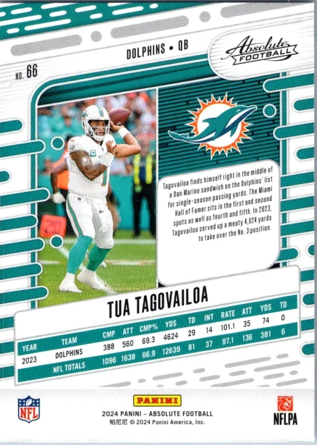 This is a nice example of a 2024 Panini Absolute #66 Tua Tagovailoa Retail