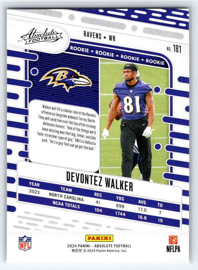 You are purchasing a 2024 Panini Absolute Devontez Walker #181 Retail RC. You will receive the exact item in the photographs. Thank you for looking.