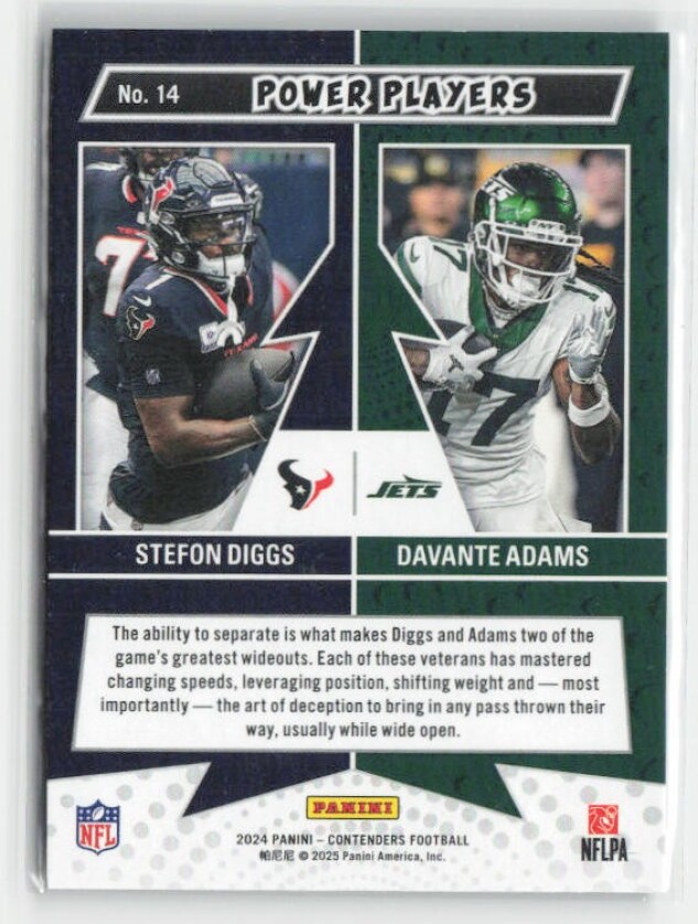 You are purchasing a 2024 Panini Contenders Davante Adams / Stefon Diggs #14 Power Players. You will receive the exact item in the photographs. Thank you for looking.