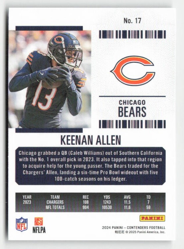 You are purchasing a 2024 Panini Contenders Keenan Allen #17. You will receive the exact item in the photographs. Thank you for looking.