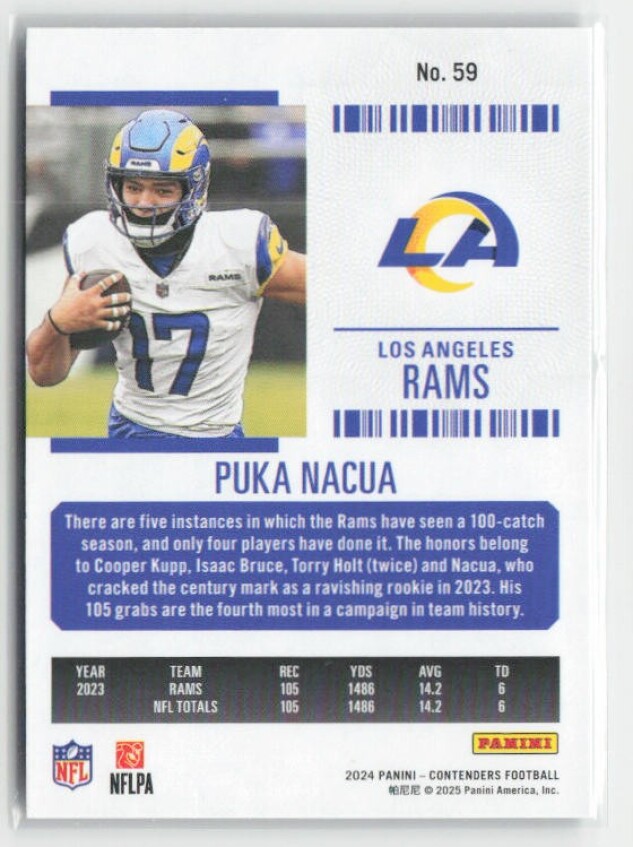 You are purchasing a 2024 Panini Contenders Puka Nacua #59 Retail. You will receive the exact item in the photographs. Thank you for looking.