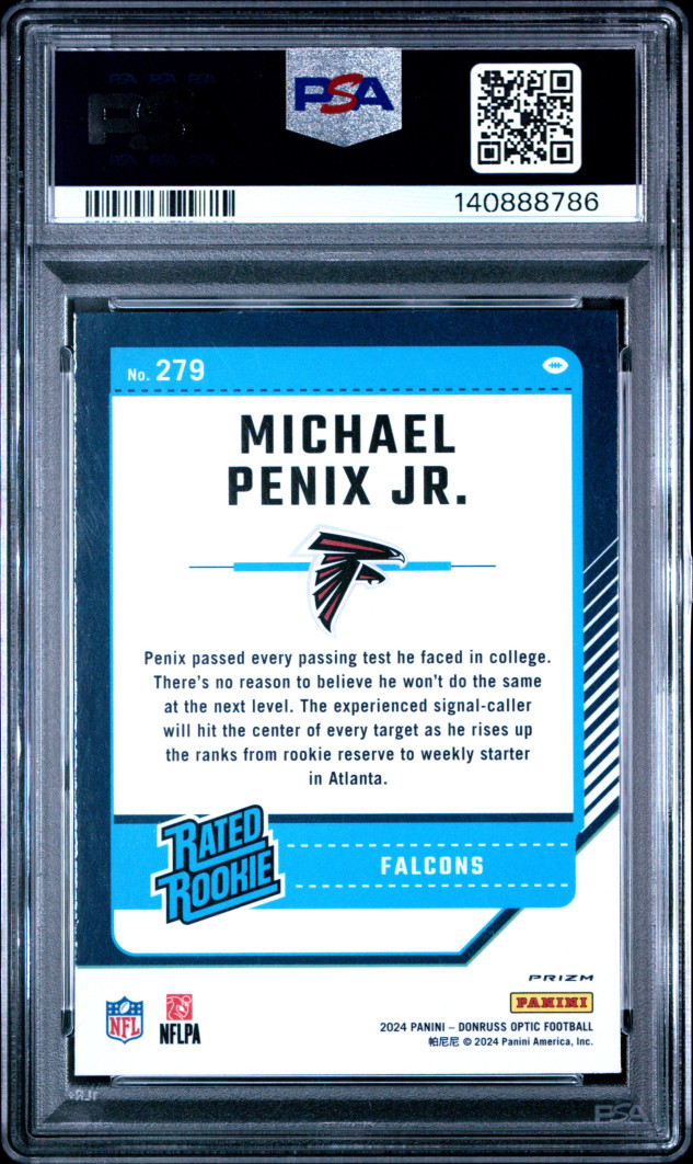 2024 DONRUSS OPTIC MICHAEL PENIX JR RATED ROOKIE ONE HUNDRED EMOJI SSP PSA 10. POP 9