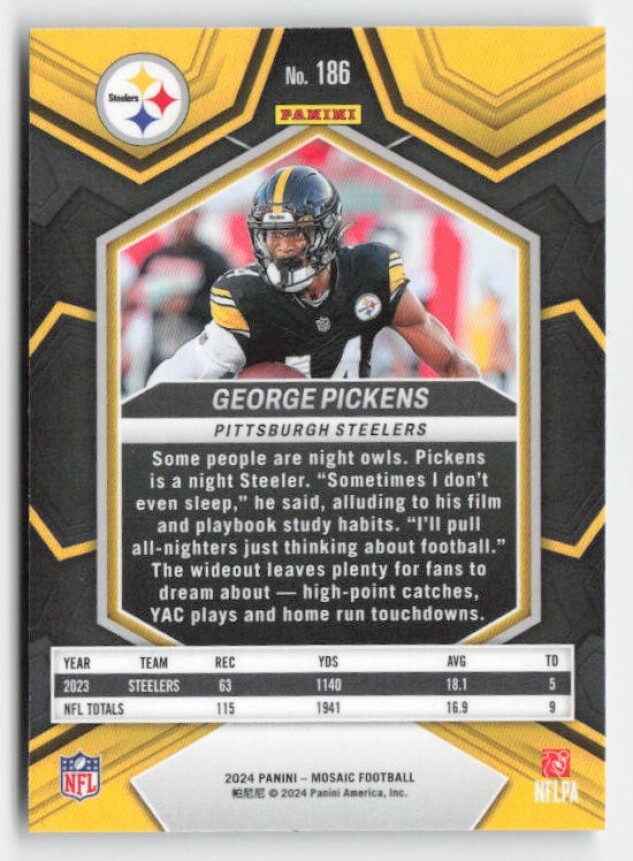 You are purchasing a 2024 Panini Mosaic George Pickens #186. You will receive the exact item in the photographs. Thank you for looking.