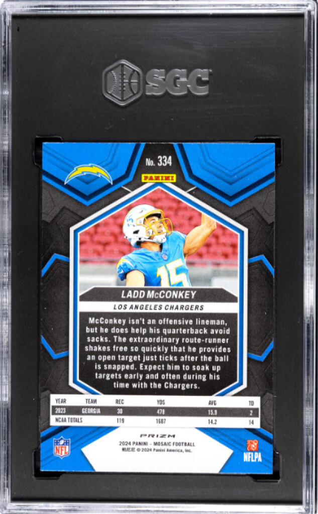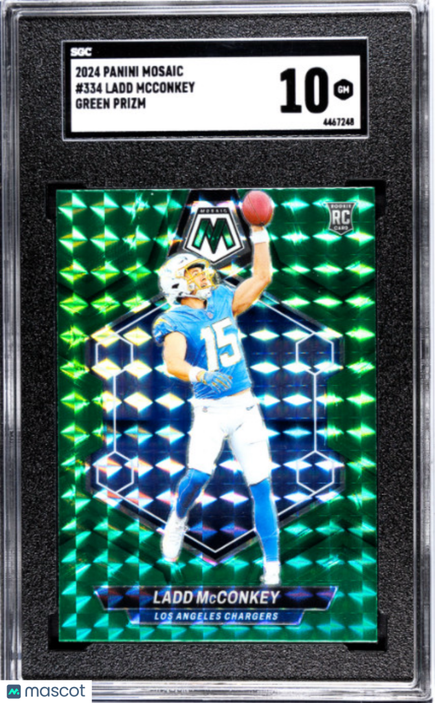 You are purchasing a 2024 Panini Mosaic Ladd McConkey #334 Mosaic Green SGC 10. You will receive the exact item in the photographs. Thank you for looking.