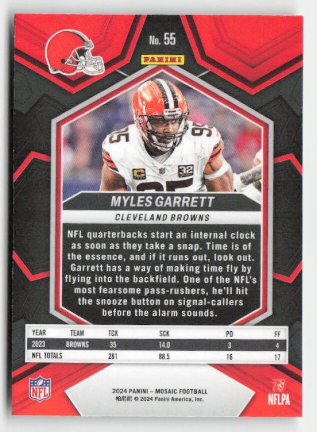 You are purchasing a 2024 Panini Mosaic Myles Garrett #55. You will receive the exact item in the photographs. Thank you for looking.