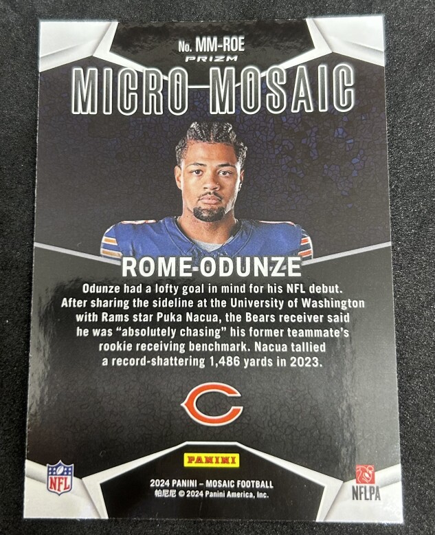 You are purchasing a 2024 Panini Mosaic Micro-Mosaic Rome Odunze #MM-ROE RC. You will receive the exact item in the photographs. Thank you for looking.