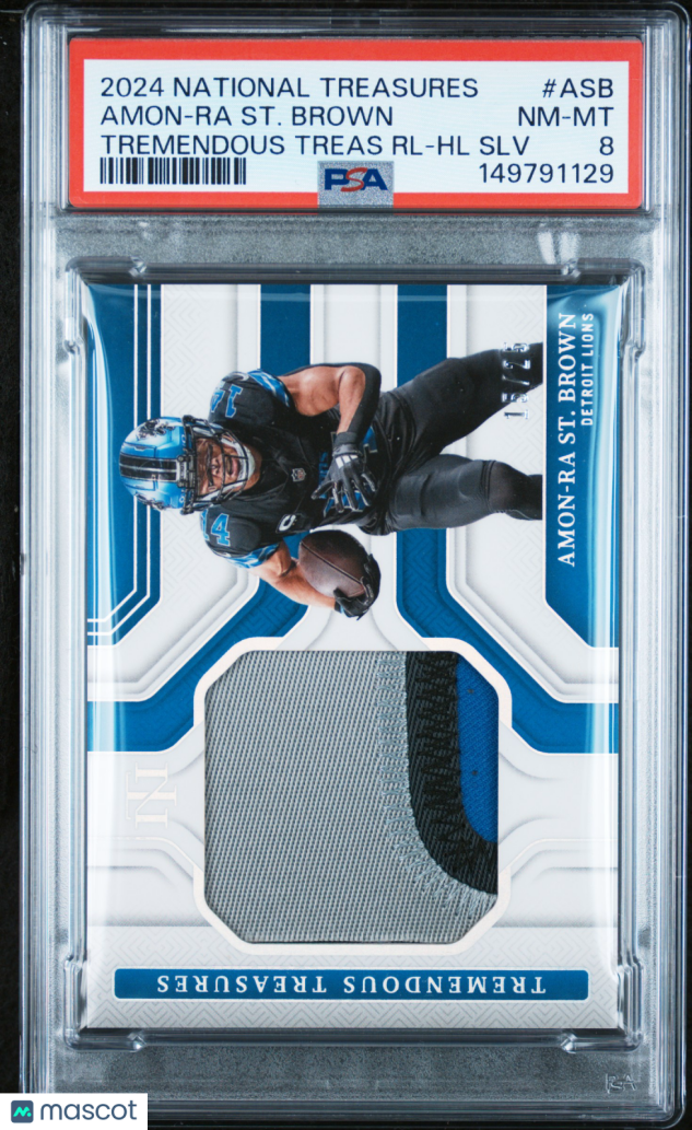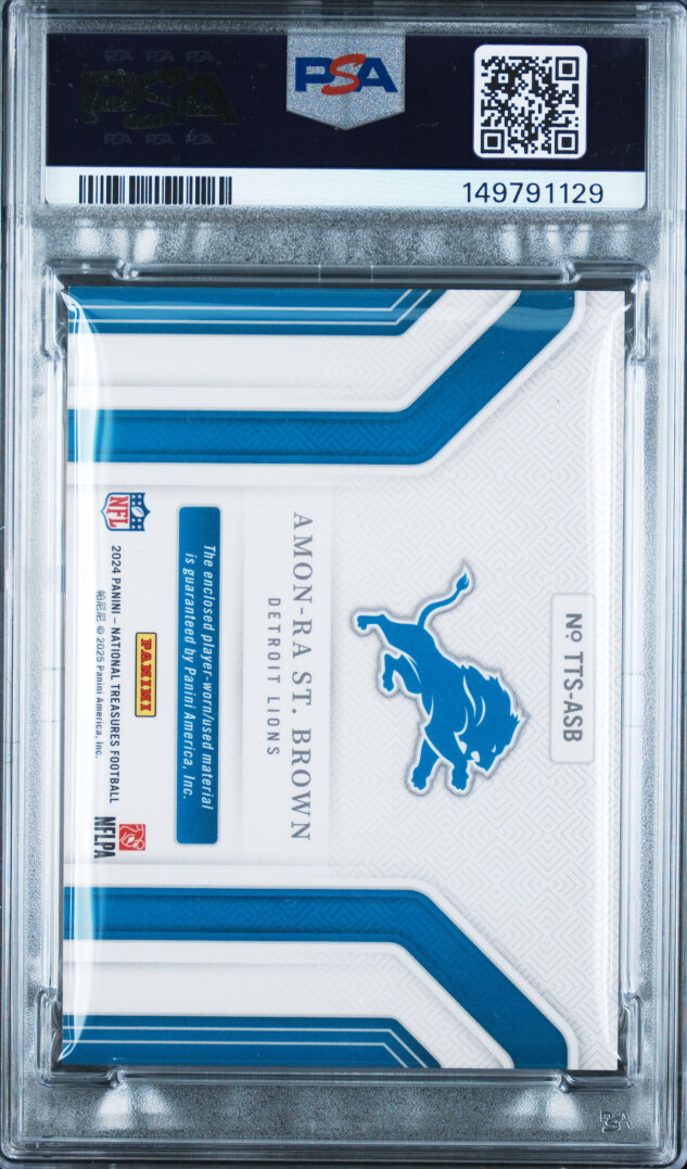 You are purchasing a 2024 Panini National Treasures Tremendous Treasures Relics Amon-Ra ST. Brown #ASB RL HL SLV 15/25 PSA 8. You will receive the exact item in the photographs. Thank you for looking.
