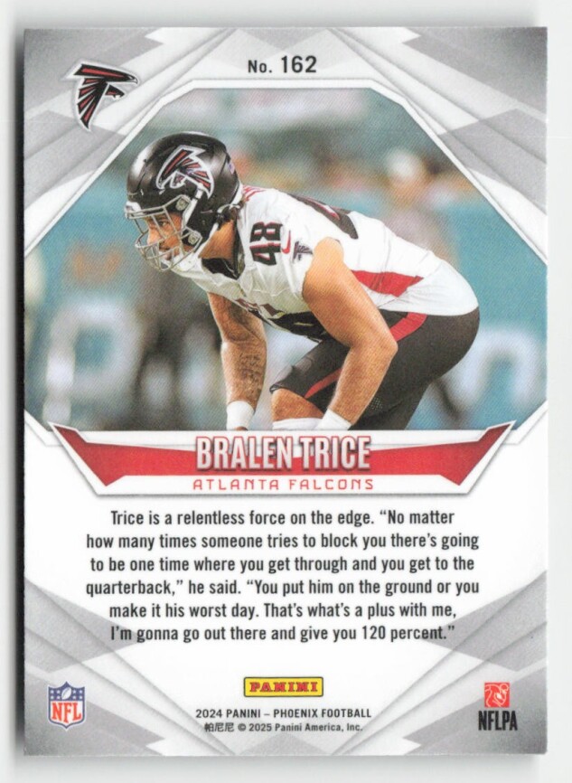 You are purchasing a 2024 Panini Phoenix Bralen Trice #162 RC. You will receive the exact item in the photographs. Thank you for looking.