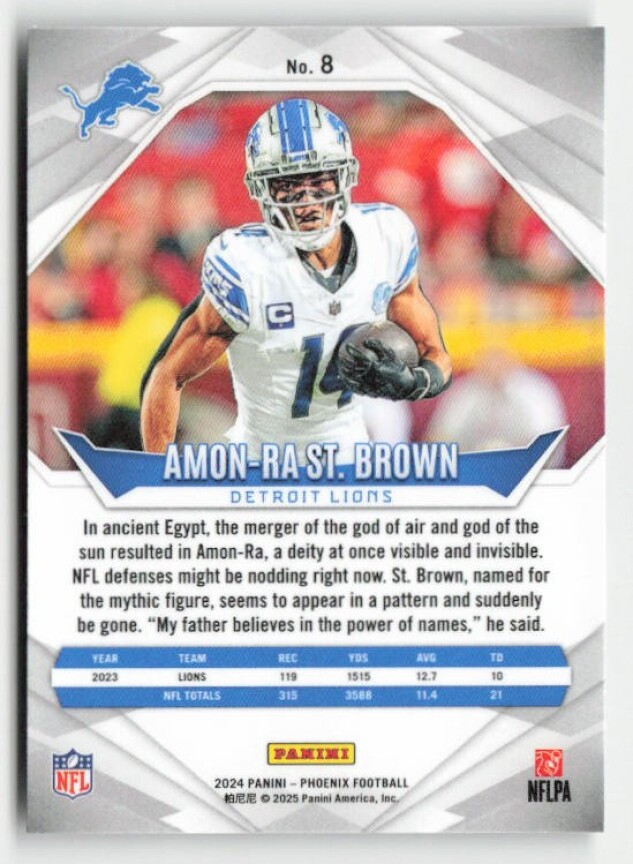 You are purchasing a 2024 Panini Phoenix Amon-Ra St. Brown #8. You will receive the exact item in the photographs. Thank you for looking.