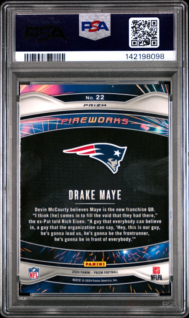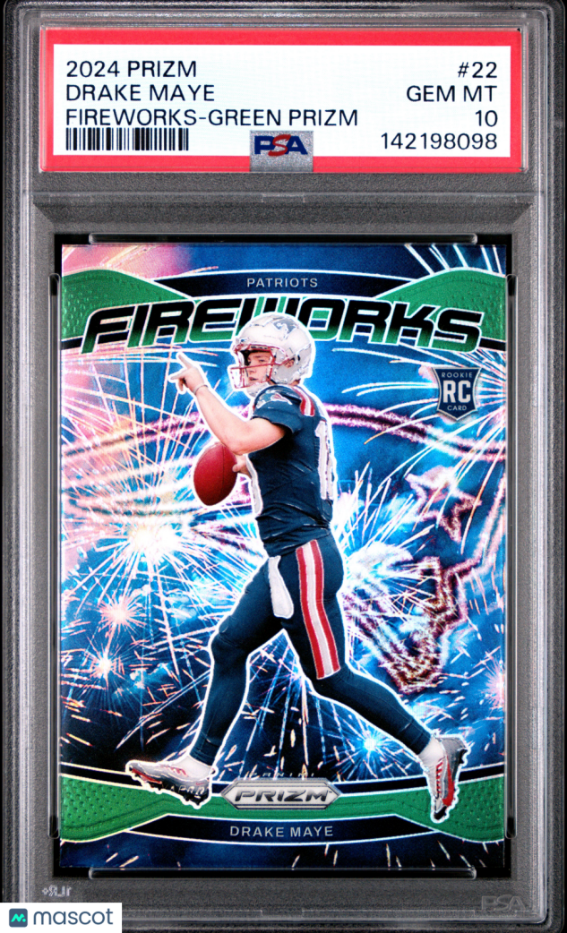 You are purchasing a 2024 Panini Prizm Fireworks Drake Maye #22 Green PSA 10. You will receive the exact item in the photographs. Thank you for looking.