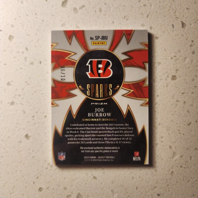 You are purchasing a 2024 Panini Select Prizm Sparks Joe Burrow Gold Mojo. You will receive the exact item in the photographs. Thank you for looking.