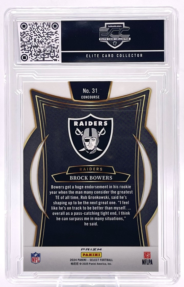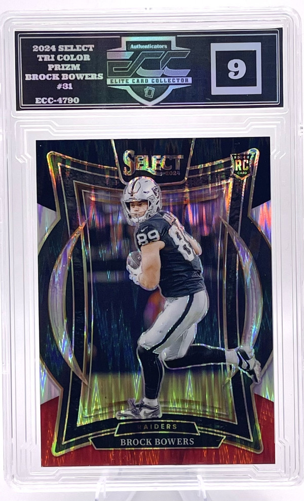 The 2024 Panini Select Concourse Brock Bowers #31 Black & Red Shock Prizm (RC) is a highly sought-after sports trading card featuring the rising star player in the National Football League. Graded at a high 9, this football card showcases Brock Bowers in his Las Vegas Raiders uniform, making it a valuable addition to any collector's set. As part of the Panini Select series, this card offers unique parallel variety with its Black & Red Shock Prizm design, perfect for fans of the sport looking for something visually appealing and exclusive