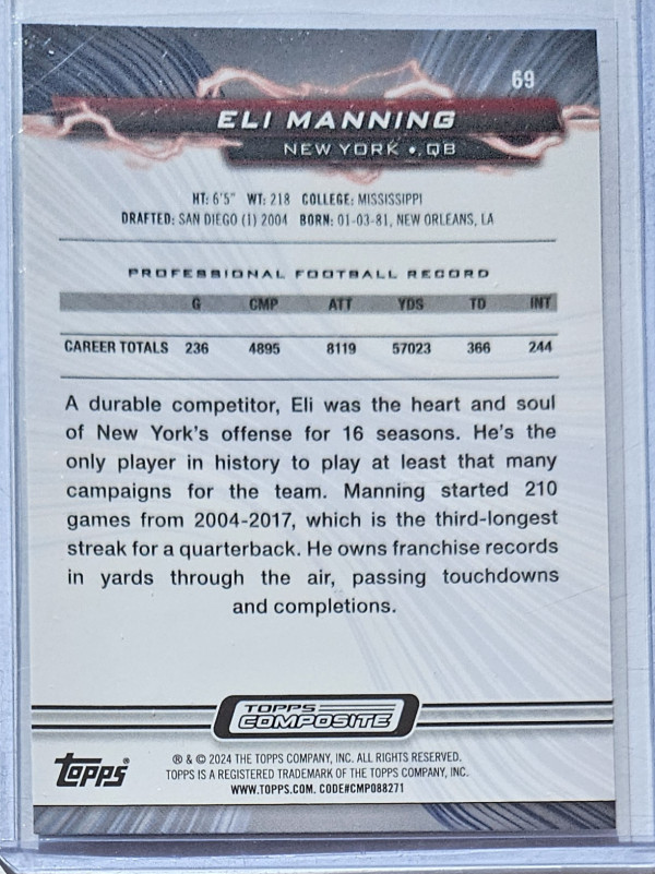 2024 Topps Composite Eli Manning #69. *Card will ship in protective sleeves and a cardboard box, I do not ship using PWE or BM. (WAS930)