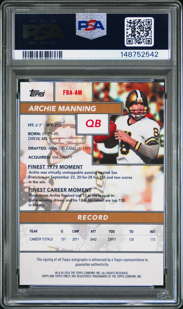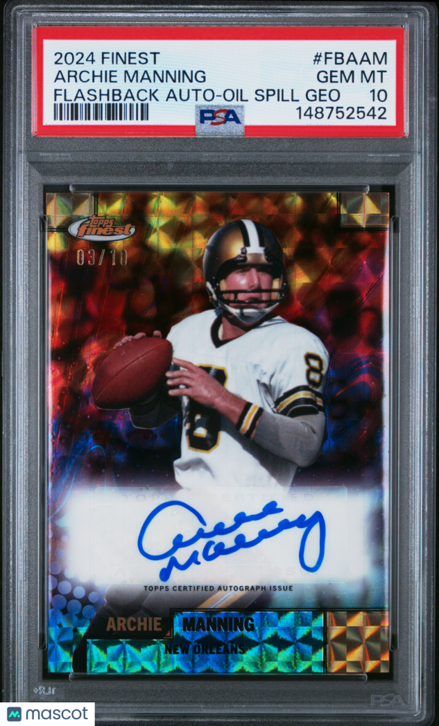 You are purchasing a 2024 Topps Finest Archie Manning #FBAAM Oil Spill Geo Auto /10 PSA 10. Thank you for looking.