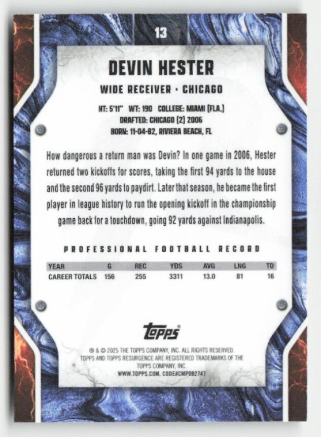 You are purchasing a 2024 Topps Resurgence Devin Hester #13 BEST KICKOFF RETURNER EVER!!!. You will receive the exact item in the photographs. Thank you for looking.