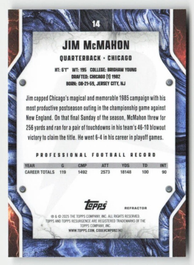 You are purchasing a 2024 Topps Resurgence Jim McMahon #14 Prism. You will receive the exact item in the photographs. Thank you for looking.