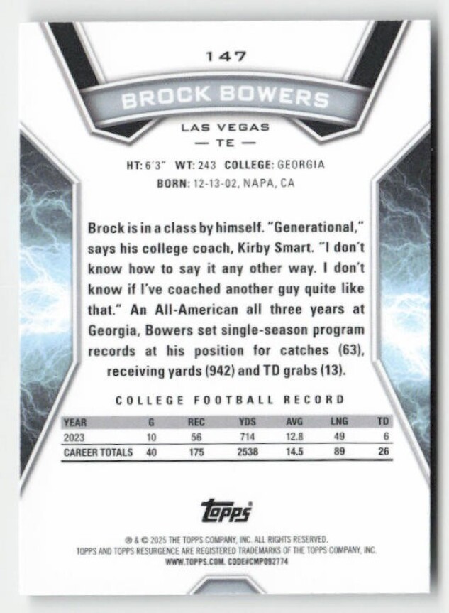 You are purchasing a 2024 Topps Resurgence Brock Bowers #147 RC. You will receive the exact item in the photographs. Thank you for looking.