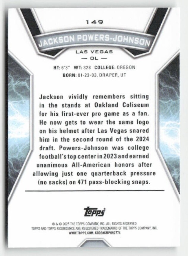 You are purchasing a 2024 Topps Resurgence Jackson Powers-Johnson #149 RC. You will receive the exact item in the photographs. Thank you for looking.