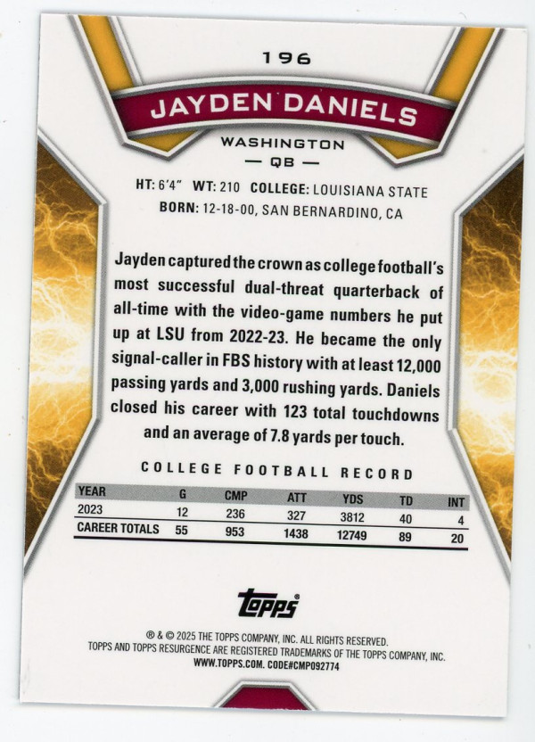 2024 Topps Resurgence #196 Jayden Daniels Blue and Orange Spark Rookie