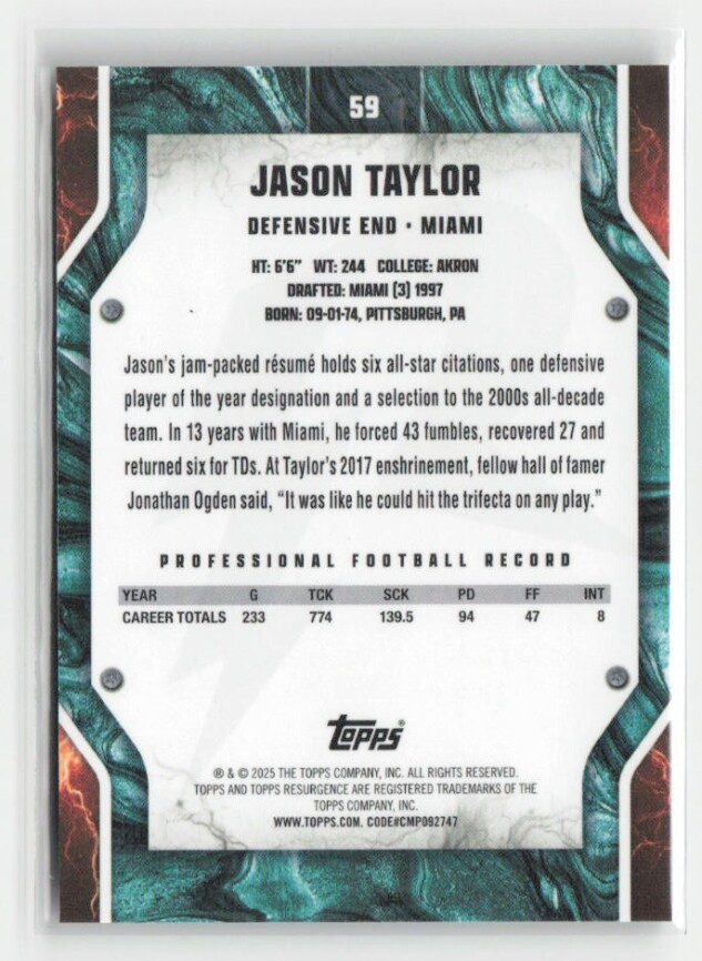 You are purchasing a 2024 Topps Resurgence Jason Taylor #59. You will receive the exact item in the photographs. Thank you for looking.