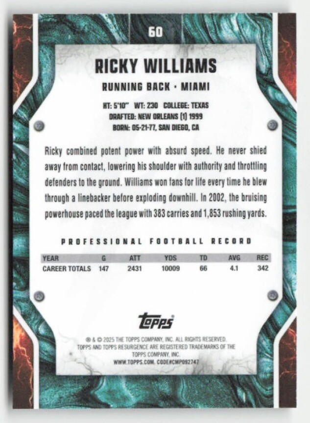 You are purchasing a 2024 Topps Resurgence Ricky Williams #60. You will receive the exact item in the photographs. Thank you for looking.