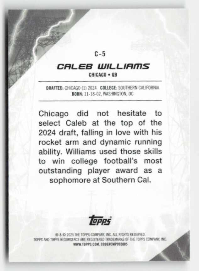 You are purchasing a 2024 Topps Resurgence - Conductors Caleb Williams #C-5. You will receive the exact item in the photographs. Thank you for looking.