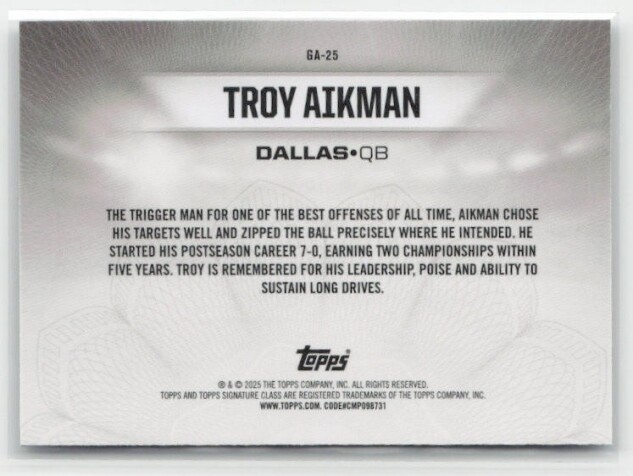 You are purchasing a 2024 Topps Signature Class Troy Aikman #GA-25 Gridiron Ambassadors. You will receive the exact item in the photographs. Thank you for looking.