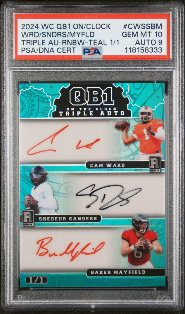 2024 Wild Card Qb1 On The Clock Hobby Triple Autographs Ward/Sanders/Mayfield Triple Au-Rnbw-Teal 1/1 PSA 10 AUTO 9