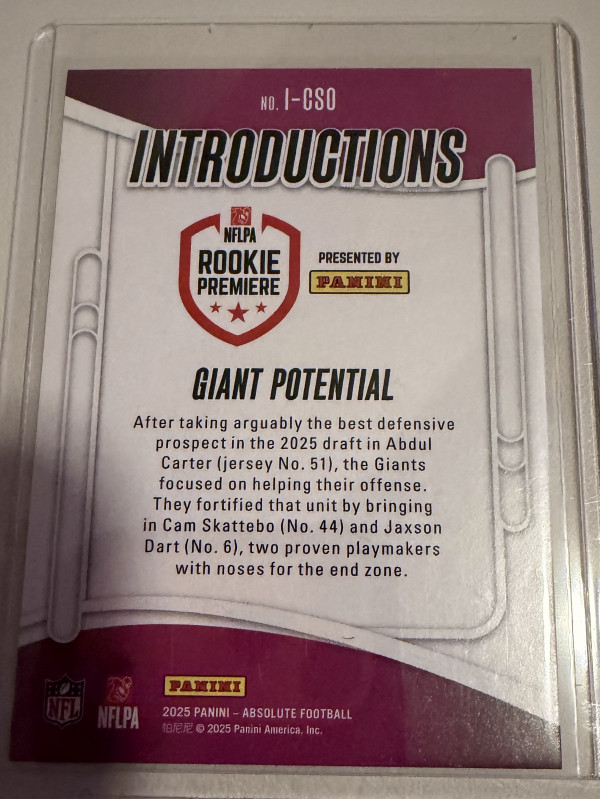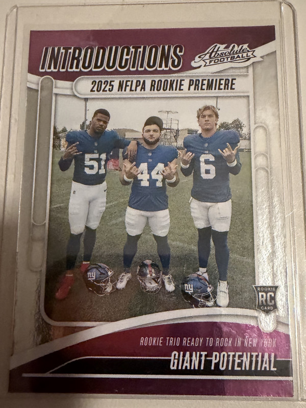 Featuring New York Giants rookies from the 2025 NFLPA Rookie Premiere. Sick group shot, rookie RC badge, and a great long-term hold or PC piece for Giants fans.