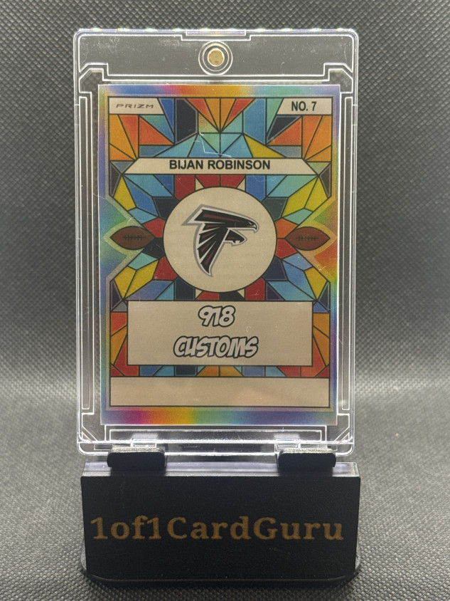 Show off your collection with this stunning Bijan Robinson custom card featuring a bold stained-glass style background and vibrant rainbow finish. This card is a one-of-a-kind custom design โ€“ perfect for Falcons fans and collectors who want something unique that stands out from standard releases.