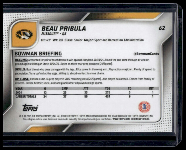 You are purchasing a 2025 Bowman U Chrome Beau Pribula #62 Gold Refractor 11/50. You will receive the exact item in the photographs. Thank you for looking.