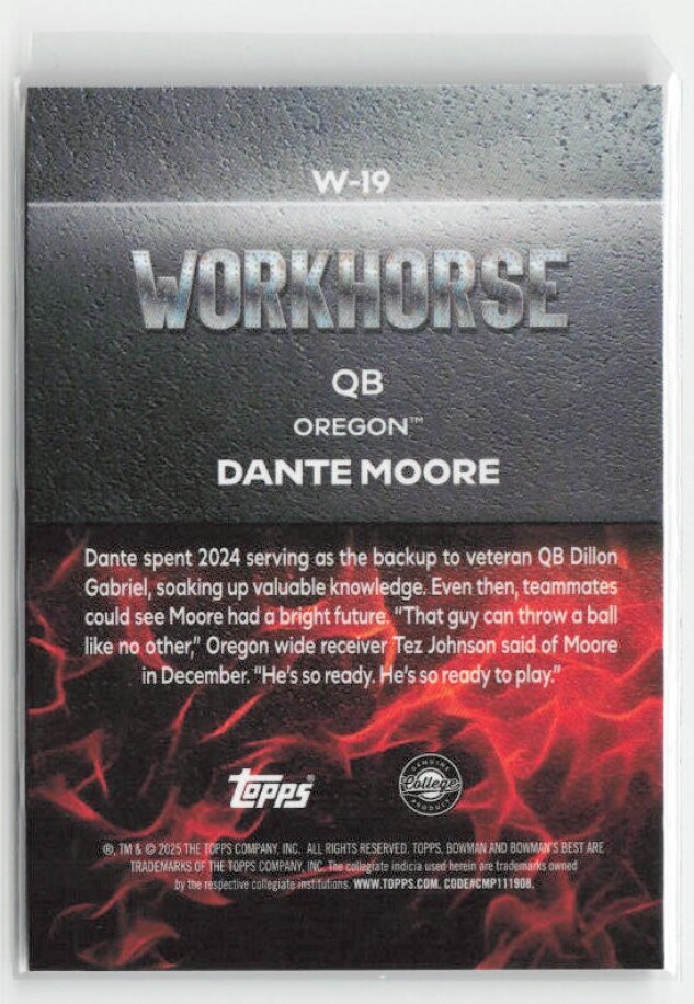 You are purchasing a 2025 Bowman University Best Dante Moore #W-19 Workhorse. You will receive the exact item in the photographs. Thank you for looking.