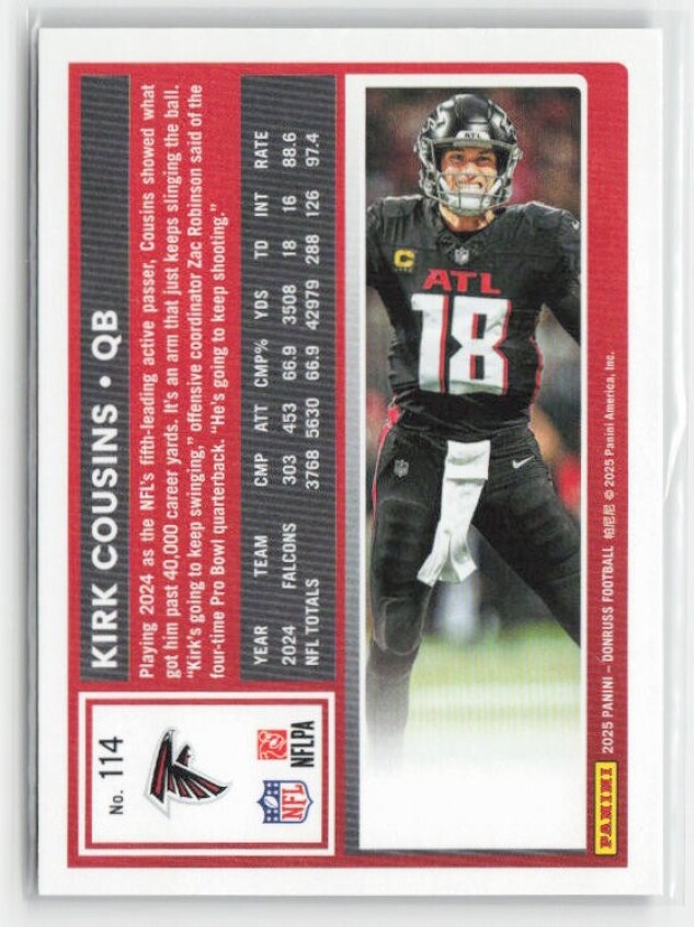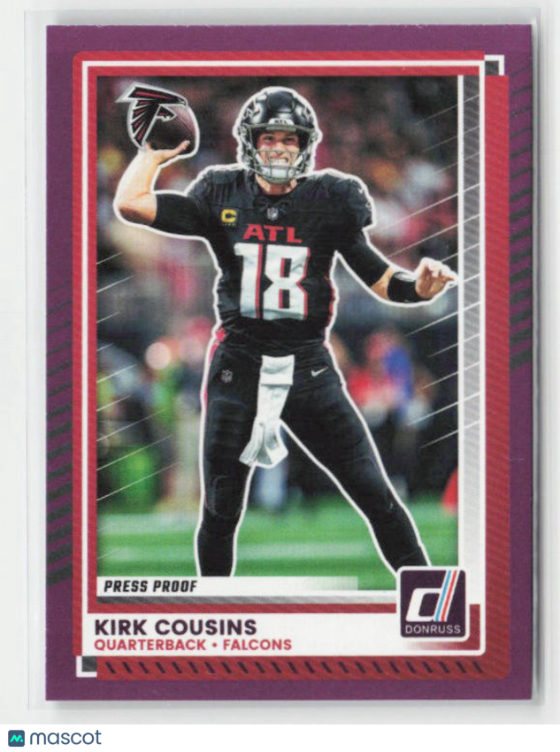 You are purchasing a 2025 Donruss Kirk Cousins #114 Press Proofs Purple. You will receive the exact item in the photographs. Thank you for looking.