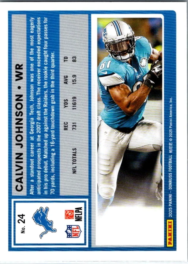 This is a nice example of a 2025 Donruss #24 Calvin Johnson Press Proofs Green