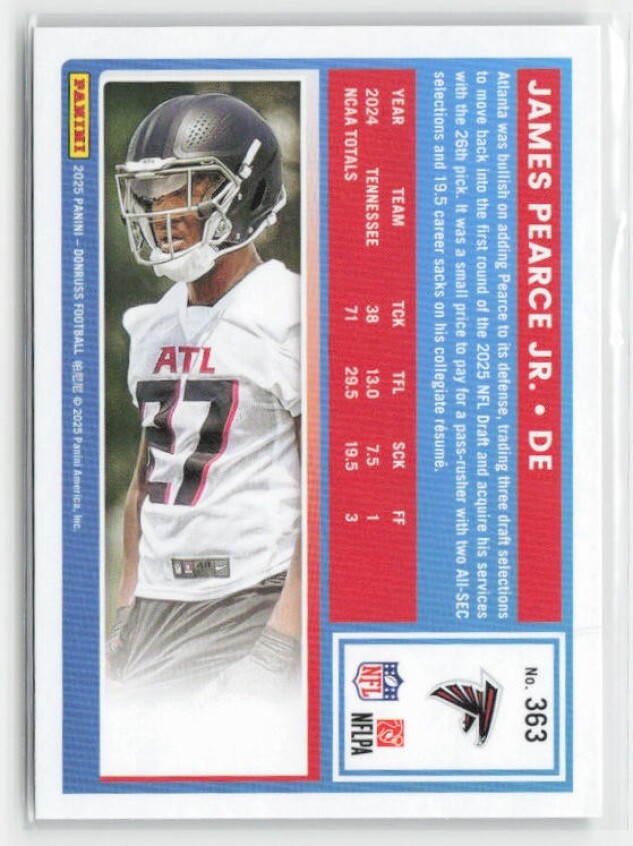 You are purchasing a 2025 Donruss James Pearce Jr. #363 RC. You will receive the exact item in the photographs. Thank you for looking.