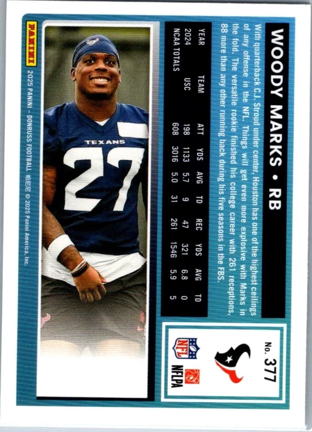 This is a nice example of a 2025 Donruss #377 Woody Marks