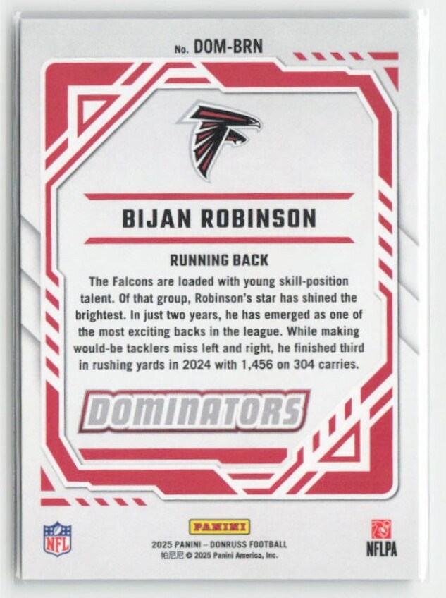 You are purchasing a 2025 Donruss Bijan Robinson #DOM-BRN Dominators. You will receive the exact item in the photographs. Thank you for looking.