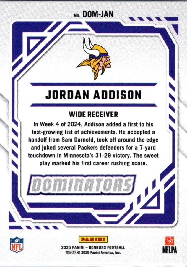 This is a nice example of a 2025 Donruss #DOM-JAN Jordan Addison Dominators