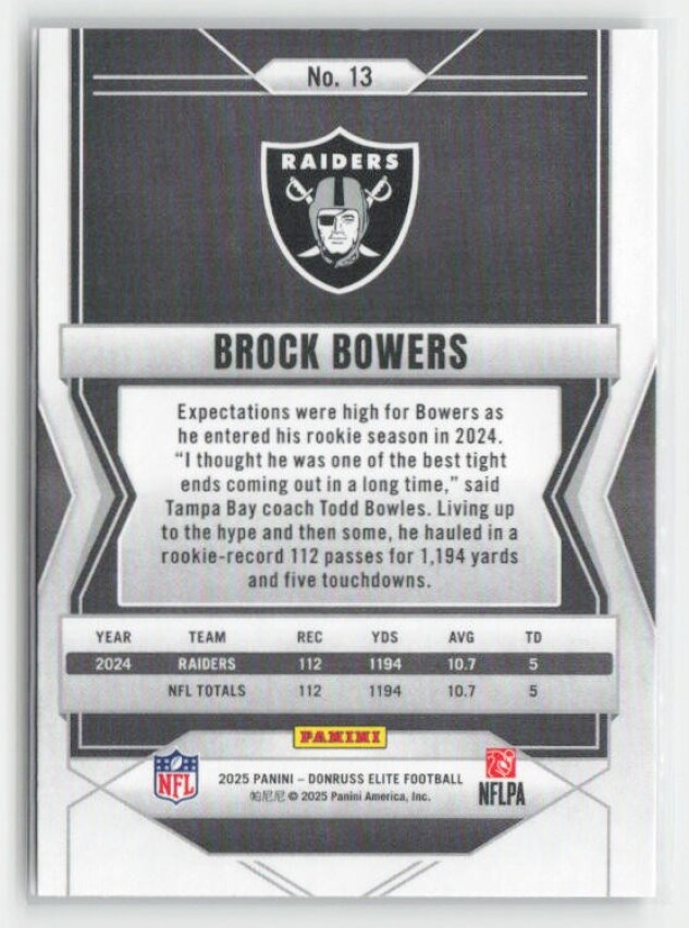 You are purchasing a 2025 Donruss Elite Brock Bowers #13. You will receive the exact item in the photographs. Thank you for looking.