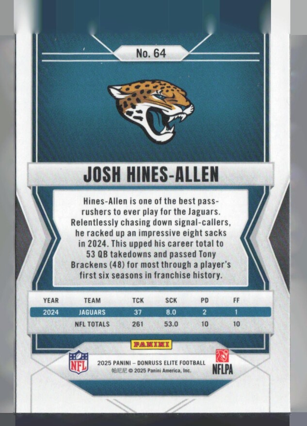 You are purchasing a 2025 Donruss Elite Josh Hines-Allen #64 Green Disco. You will receive the exact item in the photographs. Thank you for looking.