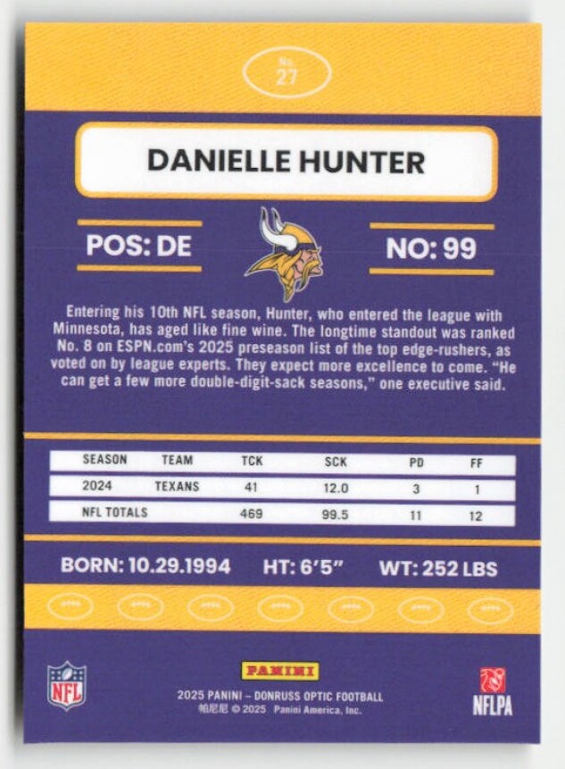 You are purchasing a 2025 Donruss Optic Danielle Hunter #27 2015 Retro. You will receive the exact item in the photographs. Thank you for looking.