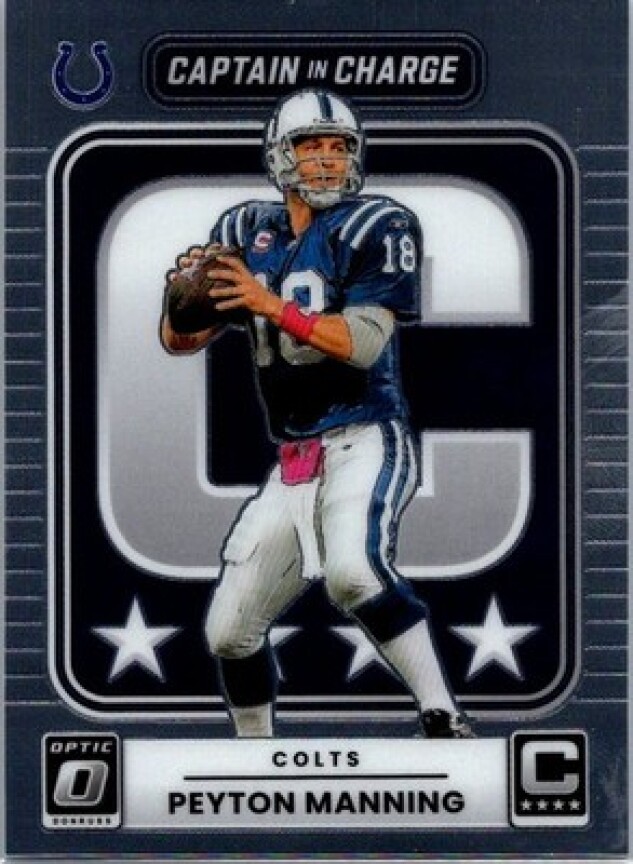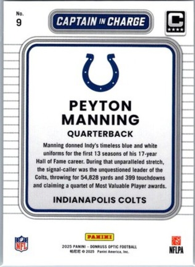 This is a nice example of a 2025 Donruss Optic #9 Peyton Manning Captain in Charge