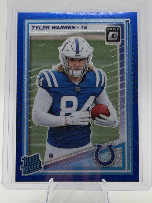 2025 Donruss Optic Tyler Warren Rated Rookie Blue Glitter parallel. Sharp color match with Colts blue. Card was pulled and immediately sleeved and top loaded.