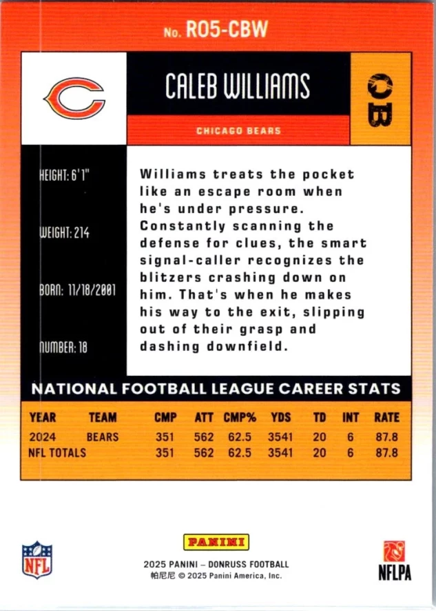 This is a nice example of a 2025 Donruss #R05-CBW Caleb Williams Retro 2005