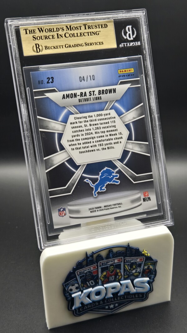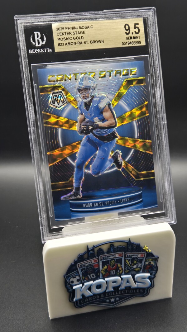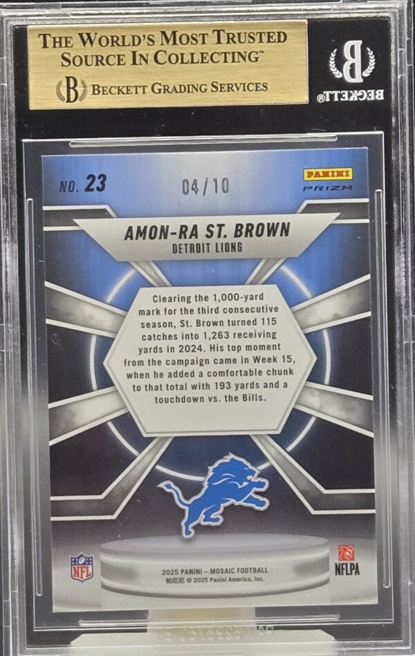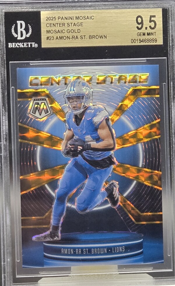 The product is a highly sought-after 2025 Panini Mosaic Center Stage Amon-Ra St. Brown #23 Gold Prizm trading card, graded as a BGS 9.5 GEM MINT. This card features Amon-Ra St. Brown, a player from the Detroit Lions in the National Football League (NFL), and is a limited edition parallel variety with only 10 copies produced. This collectible sports trading card is an original insert set from the 2025 Panini Mosaic series, making it a valuable addition to any football card collection.